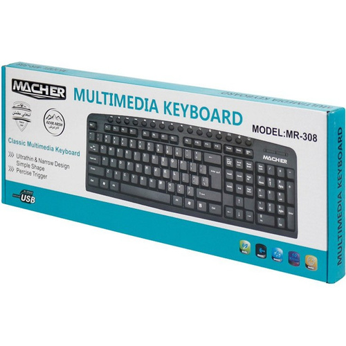استفاده از متریال پلاستیک ABS در ساخت بدنه، مقاوم در برابر فشار و ضربهبا حروف فارسی حک شده بر روی کیبورد، میزان ضربه پذیری کلید ها حدود 10 میلیون بار کلیکمقاوم در برابر رطوبت، دارای کابلی به طول 120 سانتی متر با رابط USB به منظور اتصال به سیستمدارای نشانگر LED، مجهز به 123 کلید شامل کلیدهای مولتی مدیا به منظور اجرای سریع تر دستورات، با استانداردهای CE و RoHS
